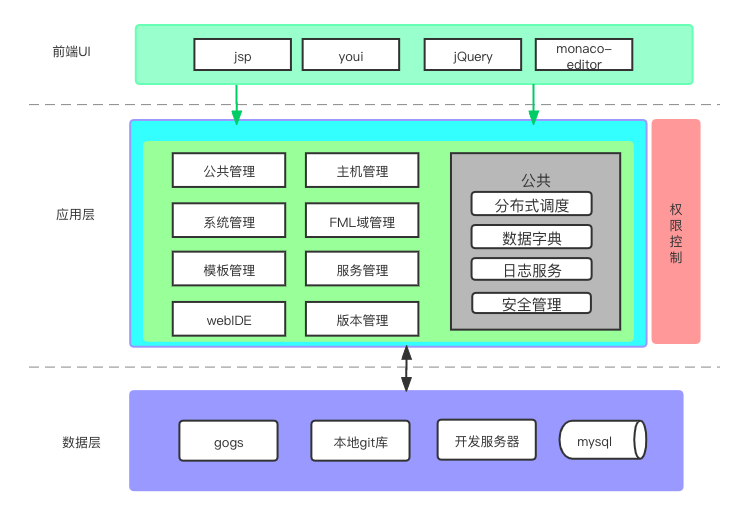 (2) 应用层:包含公共的分布式调度、数据字典、日志服务、安全管理,以及平台核心模块。该模块包含公共管理、主机管理、系统管理、FML域管理、模板管理、服务管理、web IDE、版本管理等。