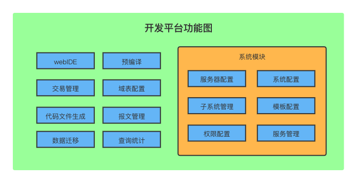 如上图所示,易捷c开发平台公共类功能主要包括web IDE、预编译、交易管理、域表配置、代码文件生成、报文管理、数据迁移、查询统计,系统模块功能主要包括服务器配置、系统配置、子系统管理、模板配置、权限配置、服务管理,各模块具体功能如下: