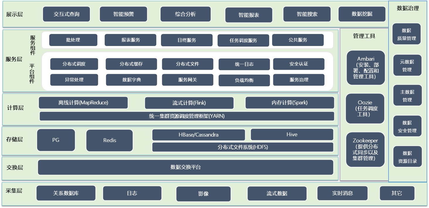 管理层提供数据治理和平台管理工具,数据治理侧重于元数据、主数据、数据质量、数据安全、数据资源目录等服务;管理工具侧重于任务调度、分布式协调、技术组件的安装、部署及配置等服务;